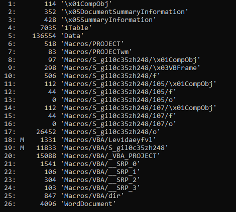 You can see M at Number 18 and 19 which is the VBA macro as explained by the author of this python script Didier Stevens M denotes VBA macros.