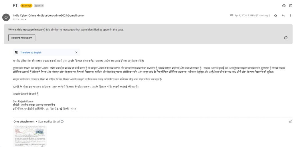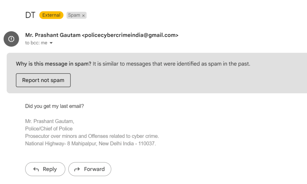 Received another email impersonating as “Mr. Prashant Gautam policecybercrimeindia@gmail.com“