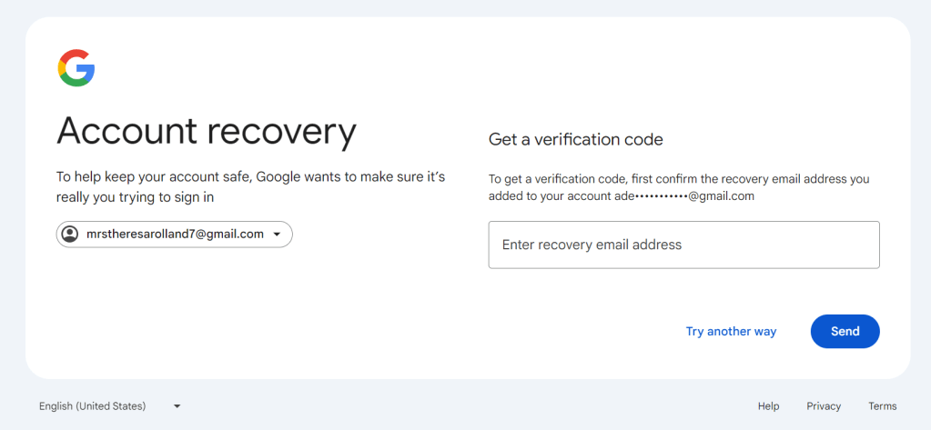 I put login email as mrstheresarolland7@gmail.com on Gmail and clicked on forgot password. It gave me Account recovery option sending verification code on alternative email id.
