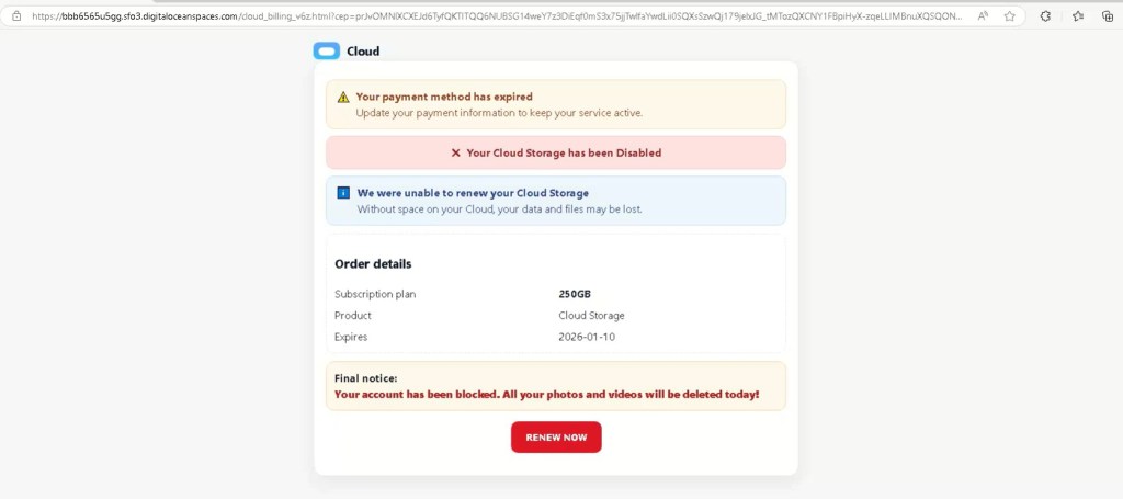 “Cloud Storage Full” phishing emails have been circulating for years, exploiting a simple but effective fear, the risk of losing personal data. While the lure itself hasn’t changed much, the way these scams make money has evolved significantly.