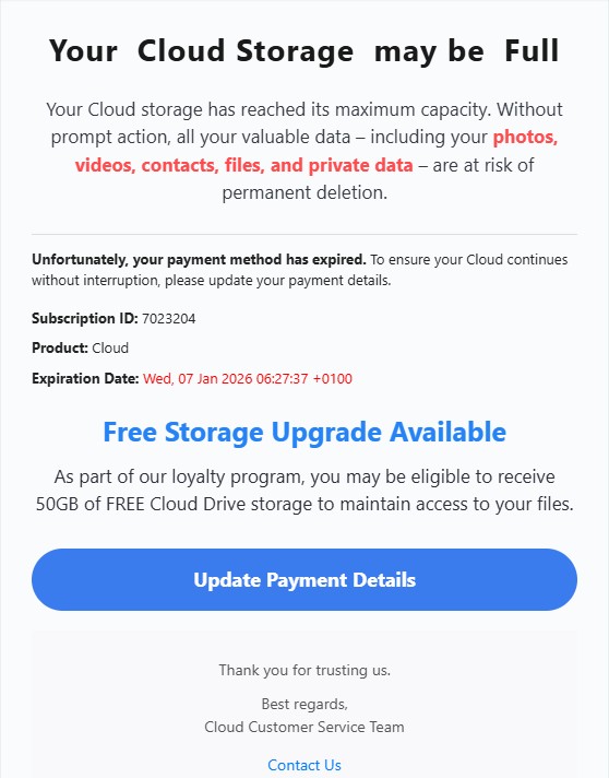 “Cloud Storage Full” phishing emails have been circulating for years, exploiting a simple but effective fear, the risk of losing personal data. While the lure itself hasn’t changed much, the way these scams make money has evolved significantly.