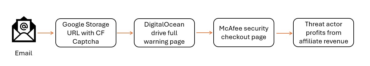 This blog walks through a recent phishing email that abuses trusted infrastructure end to end, starting from a scareware email, moving through Google Cloud hosted landing pages and fake Cloudflare verification, and ultimately landing on a legitimate McAfee checkout page. It also ties this activity to a previously observed TotalDrive “storage full” scam, showing this is not an isolated incident but part of a broader trend.