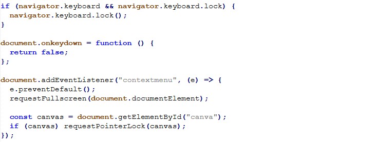 What makes this scam effective isn’t a vulnerability exploit it’s how aggressively it traps the user in the browser and makes the experience feel “system level”. The JavaScript focuses on three high impact goals, force full screen, restrict user input, and block escape/navigation, while adding audio pressure to increase panic.