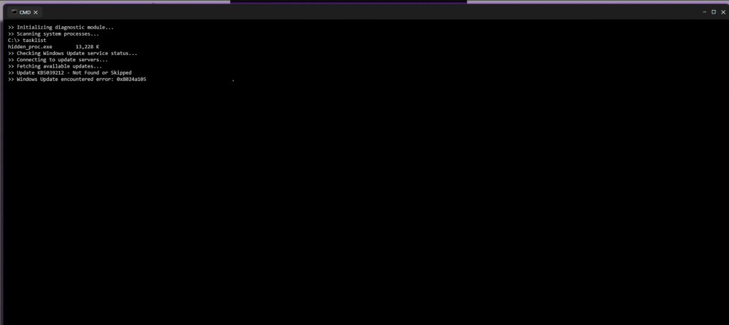 Shortly after the security alert appears, the page transitions into what looks like a Windows Command Prompt window. Text begins scrolling automatically, claiming that a diagnostic scan is running. Messages such as “Initializing diagnostic module,” “Scanning system processes,” and “Checking Windows Update” are displayed alongside fake process names and memory usage values.
