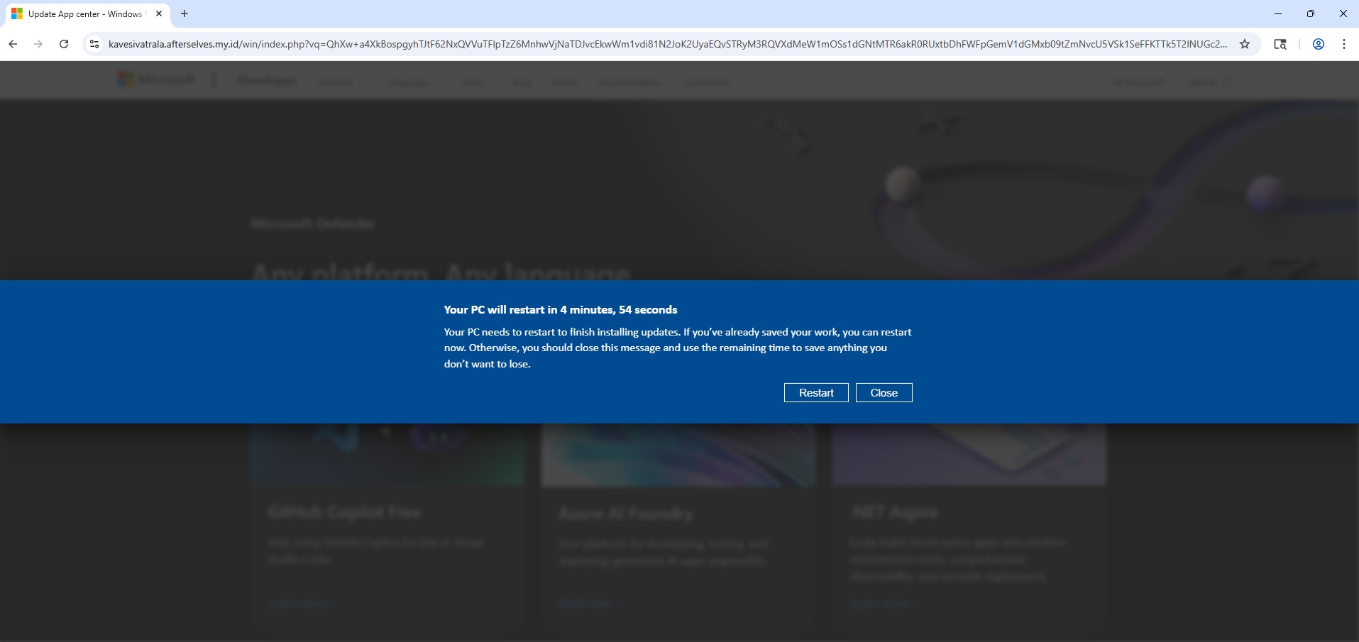 Once the final page loads, the scam begins immediately. The user is presented with a screen that closely resembles a legitimate Windows Update notification. A dialog appears stating that the system will restart in five minutes to complete updates, complete with a live countdown timer.