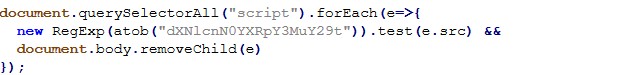 This short script searches loaded <script> tags and removes any whose src matches a Base64 decoded pattern. It’s consistent with “cleaning” unwanted third party scripts (or selectively disabling components) during runtime.