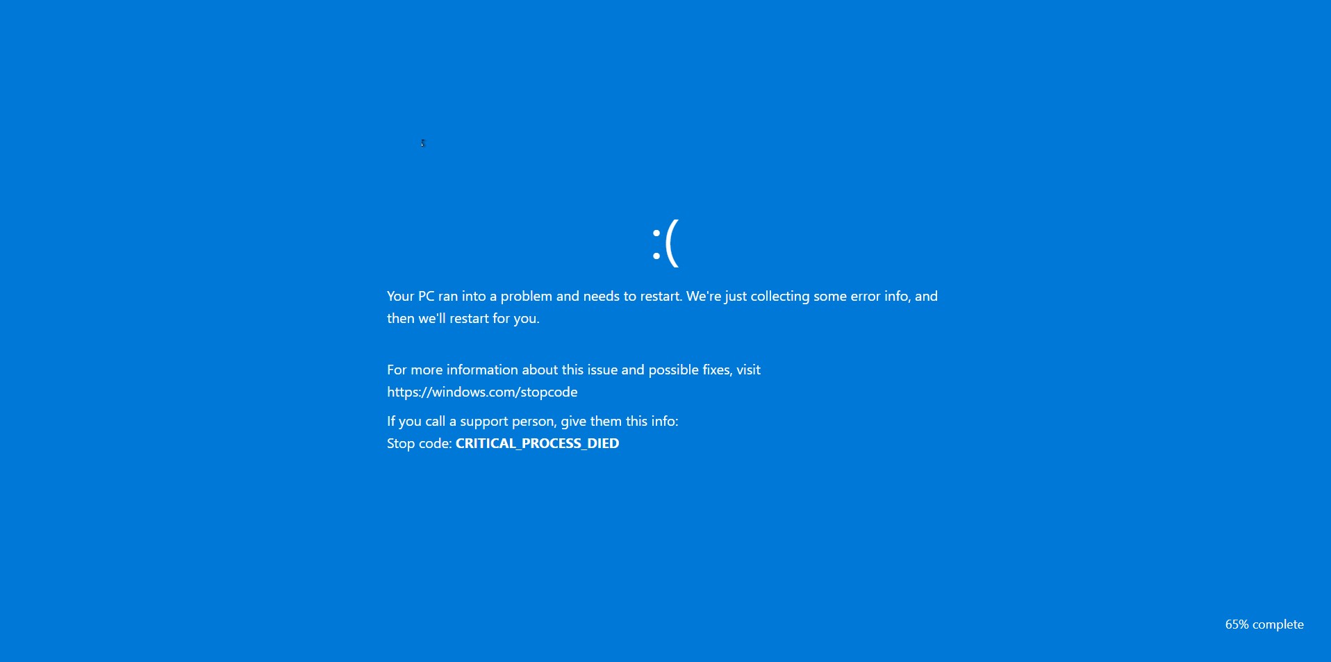 As the fake scan concludes, the browser abruptly switches to a full screen Blue Screen of Death. The screen displays a familiar Windows-style error message along with a stop code such as CRITICAL_PROCESS_DIED.