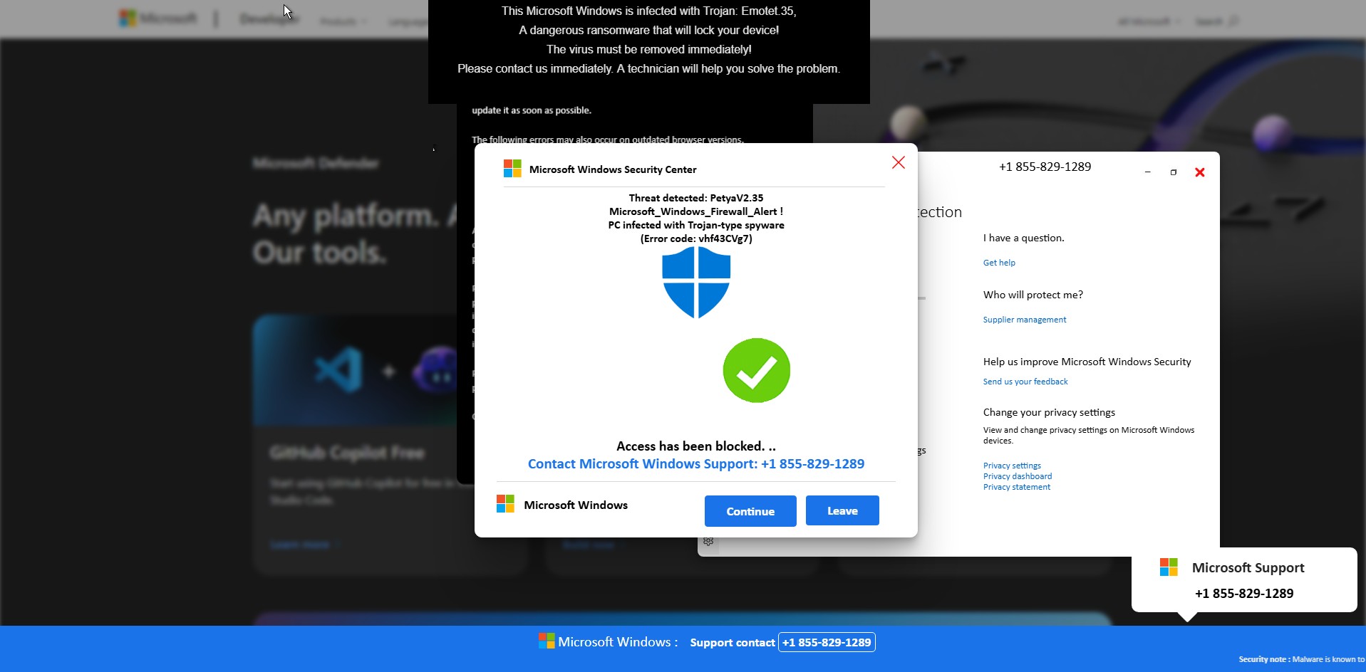 Before any visible “scan” begins, a Windows Security themed popup suddenly appears on top of the page. It claims that serious threats such as Petya and Emotet have been detected on the system and that access has been blocked for security reasons.