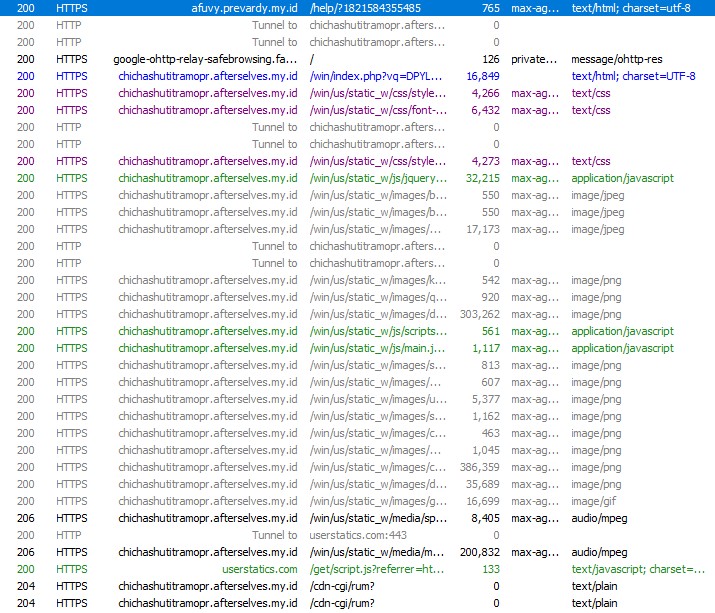 The traffic was first redirected to a .my.id domain, followed by another redirect to a randomly generated subdomain hosted under afterselves.my.id. From there, the browser was briefly sent to ipwho.org, a legitimate IP intelligence service, where information such as IP address, browser type, operating system, and user-agent was collected. After fingerprinting, the user was redirected again to the final landing page.