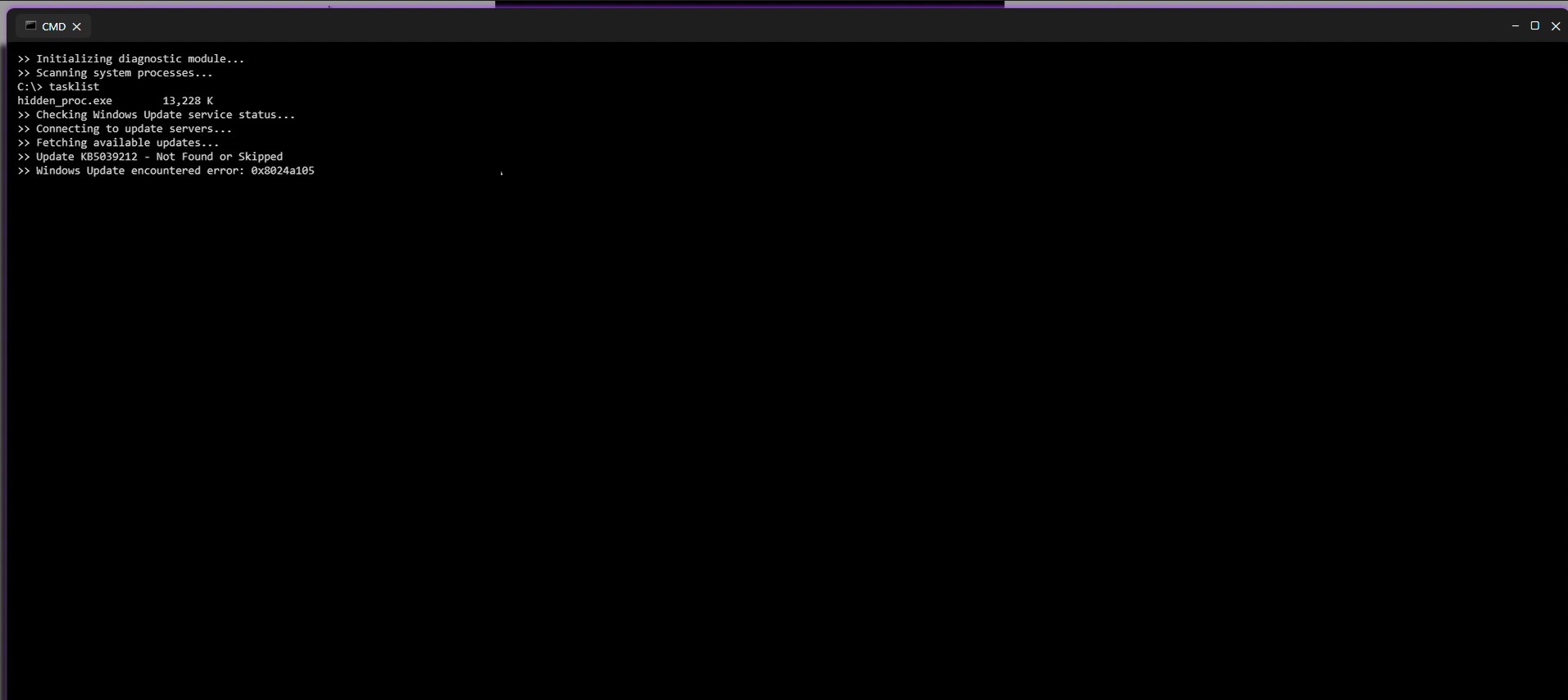 Shortly after the security alert appears, the page transitions into what looks like a Windows Command Prompt window. Text begins scrolling automatically, claiming that a diagnostic scan is running. Messages such as “Initializing diagnostic module,” “Scanning system processes,” and “Checking Windows Update” are displayed alongside fake process names and memory usage values.