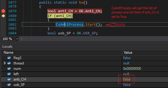 To avoid call to CsAntiProcess which look for the running process, I change the value of anti_CH bool variable value to