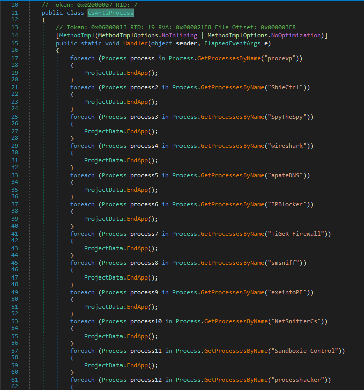 NOTE: To bypass process check, I also changed the names of process e.g. Wireshark.exe to wk.exe and procexp.exe to prex.exe which helped to by pass process check when I executed malware without debugging in dnSpy because process names are hard coded.