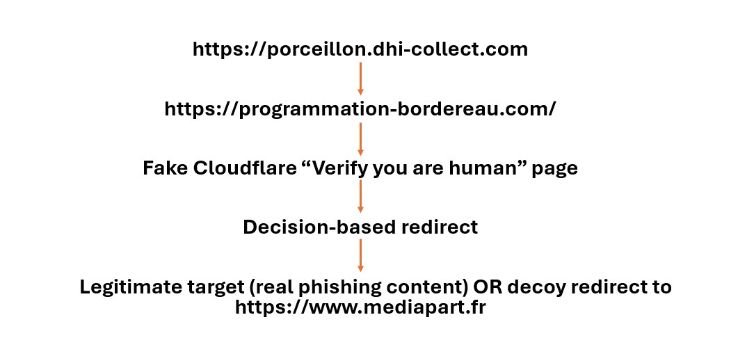 Only approved traffic (likely residential French IPs, real browsers) proceeds to the malicious landing page.