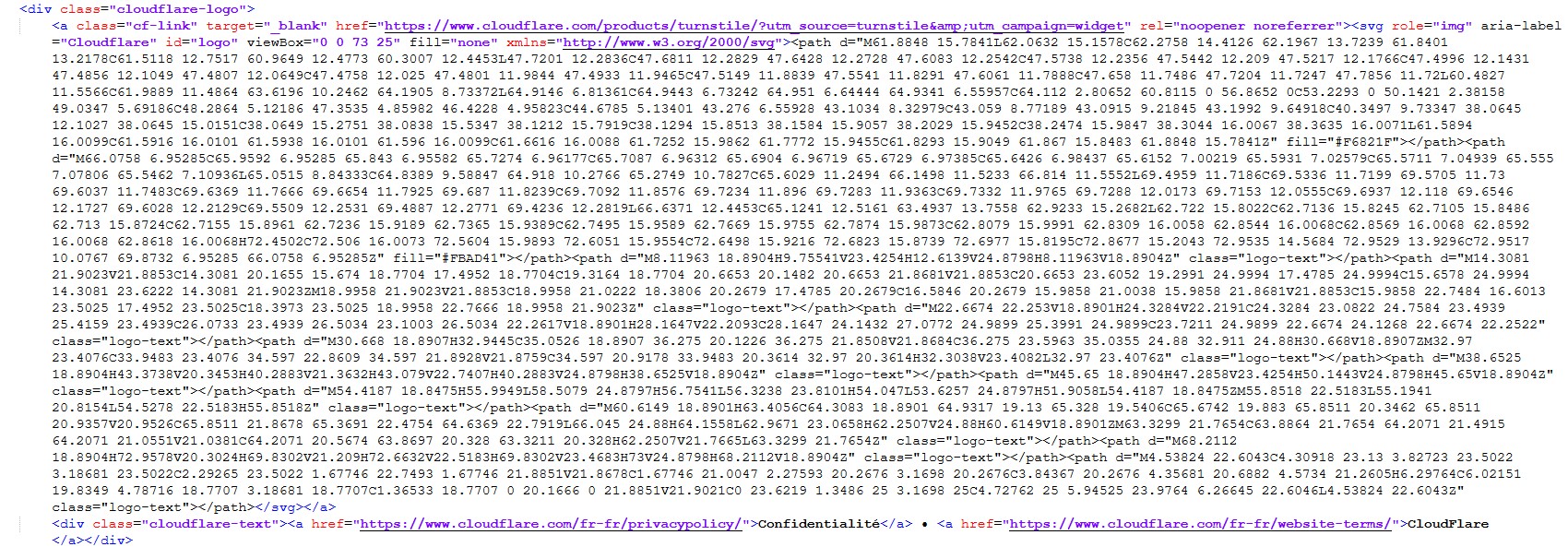 The landing page is designed to closely mimic a legitimate Cloudflare interstitial, creating a false sense of trust for the victim. It displays the French language title “Un instant…“, along with Cloudflare style branding and logos to appear authentic. A fake human verification checkbox labeled “Vérifiez que vous êtes humain” is presented, imitating Cloudflare’s Turnstile challenge, despite performing no real validation. The page also shows a fabricated Ray ID, a detail commonly associated with genuine Cloudflare error or verification pages. To further reinforce legitimacy, the attackers include links pointing to real Cloudflare policy and documentation pages, a tactic intended to reduce suspicion and bypass casual scrutiny by users and automated scanners alike.