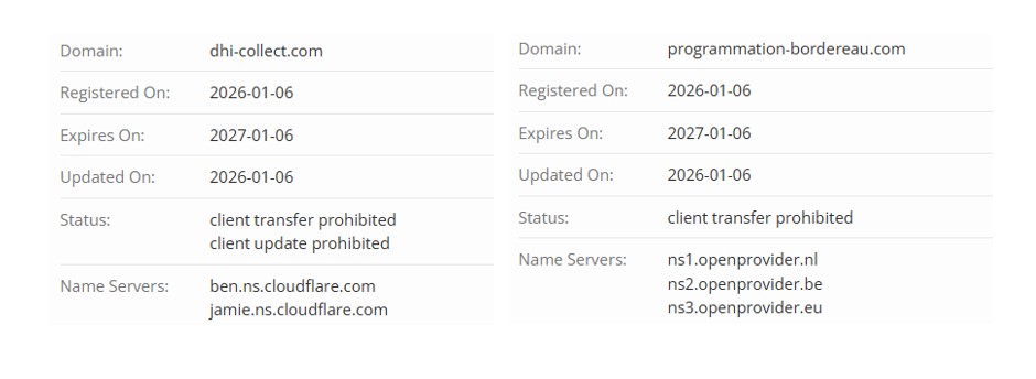 Both domains involved in the redirect chain were newly registered on 2026-01-06.